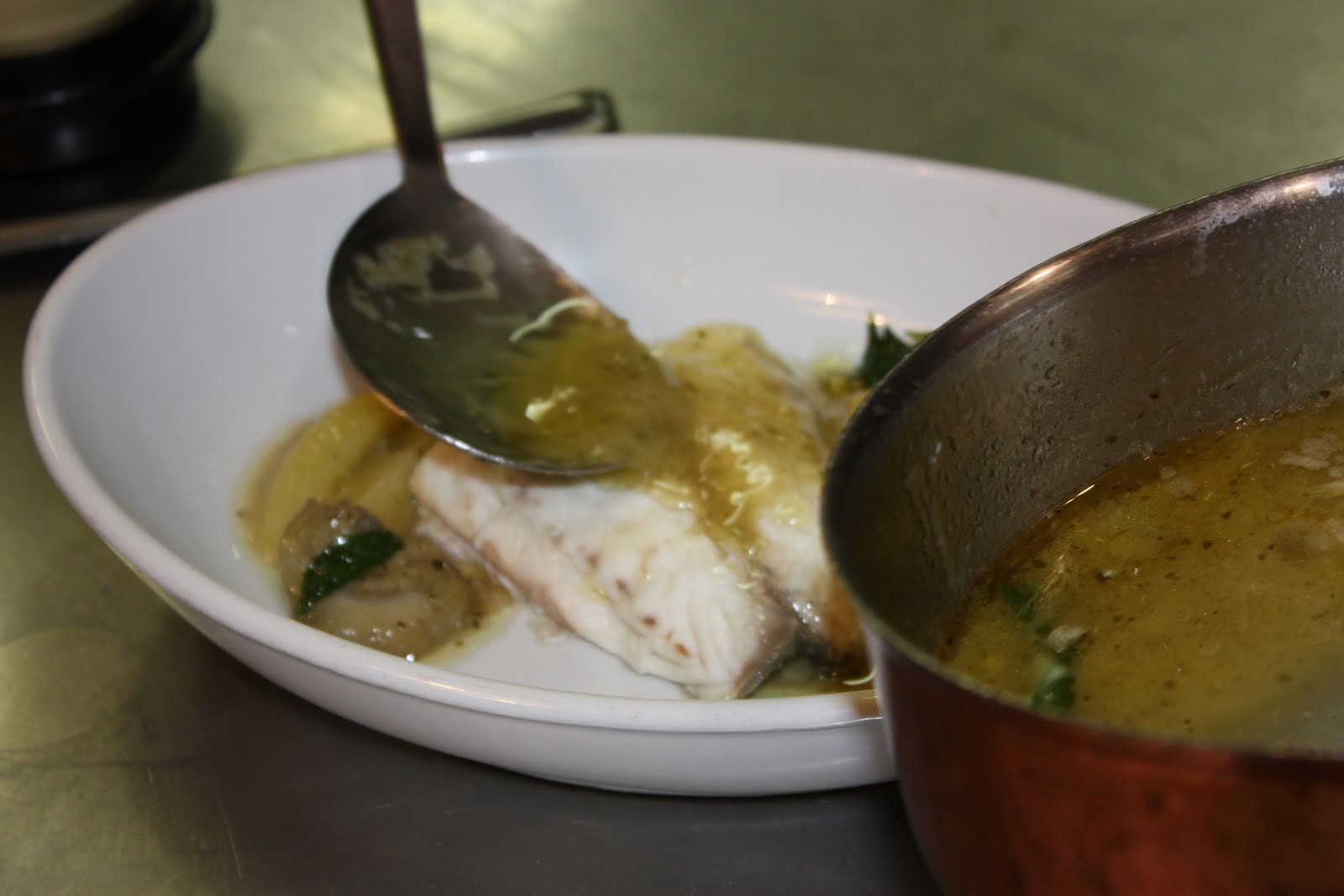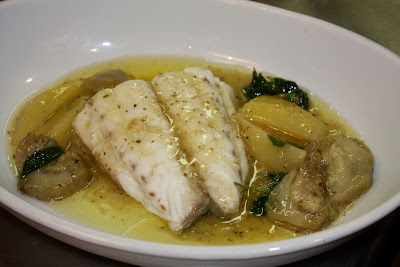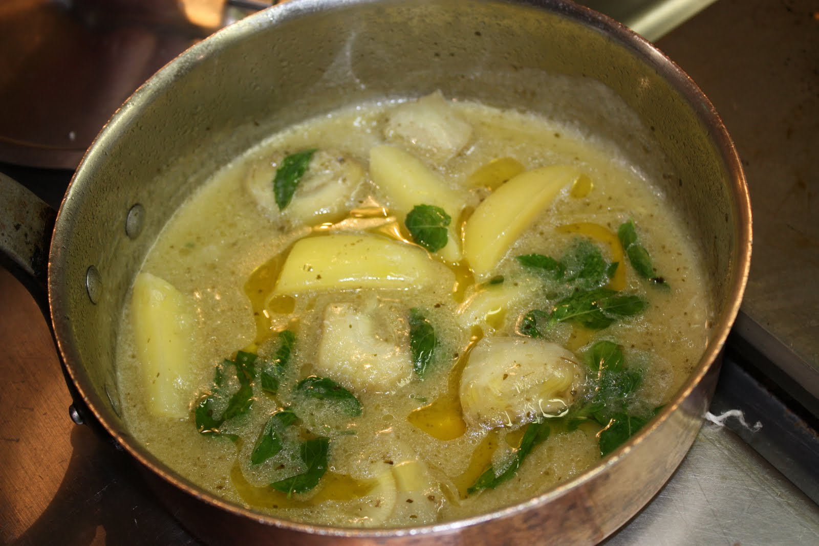 Start with a heavy pan and add 2 cups of the herb broth. Add potato and raw artichoke- let it braise. (if not artichokes, then olive). Flour the fish and put it in the broth to simmer and steam. Press with your finger to see that it springs..theAn it’s done. Make sure the broth has reduced some and emulsified. Dish fish into a bowl and pour some of the sauce over it with potatoes and artichokes (or olives) on the top or to the side.