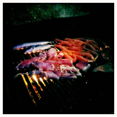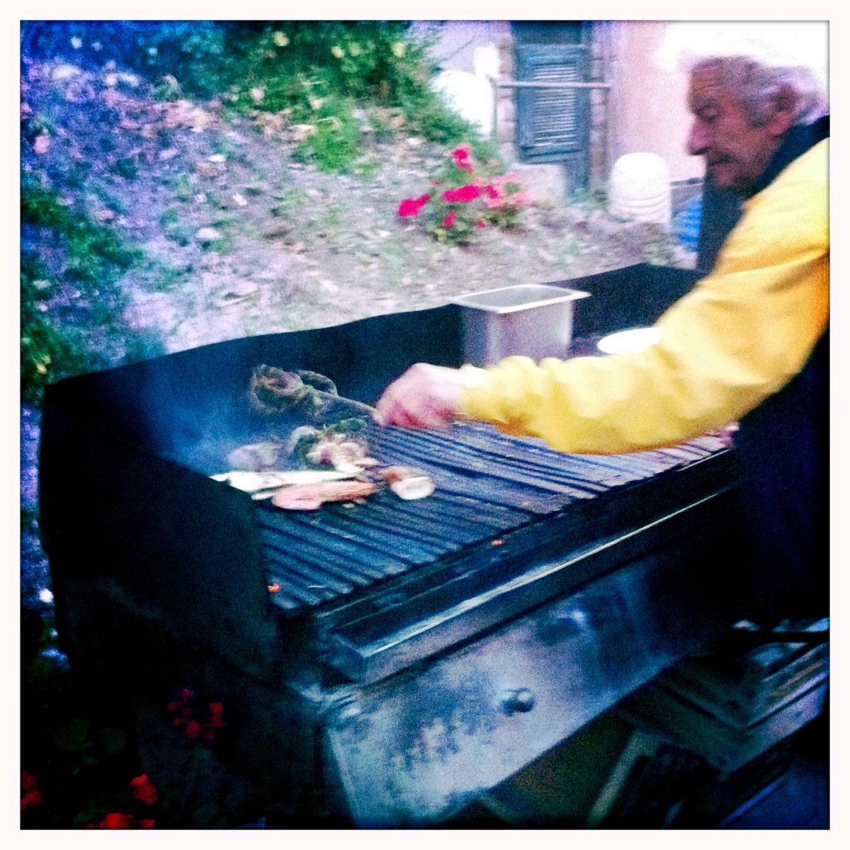 He threw everything onto the grill. A few pieces of tuna. A whole fish, prawns and curly-cued calamari. Salt and pepper were rained on them and basted with branches of mint and rosemary dipped in olive oil and garlic. A pinch of chopped aromatics were tossed on top. The fish didn’t stay long.