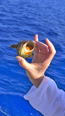 20 minutes into our sail, a rubber motor boat came screaming up to our boat. Giuseppe has his hand held high with something in it. I thought perhaps we had left something behind. He waved and said in Italian, “Questa e per Peggy….it is an occhio di Santa Lucia! Porta fortuna!” It was an eye of Santa Lucia. A shell that has a hard orange spiral, said to bring good luck. The young girls swooned.